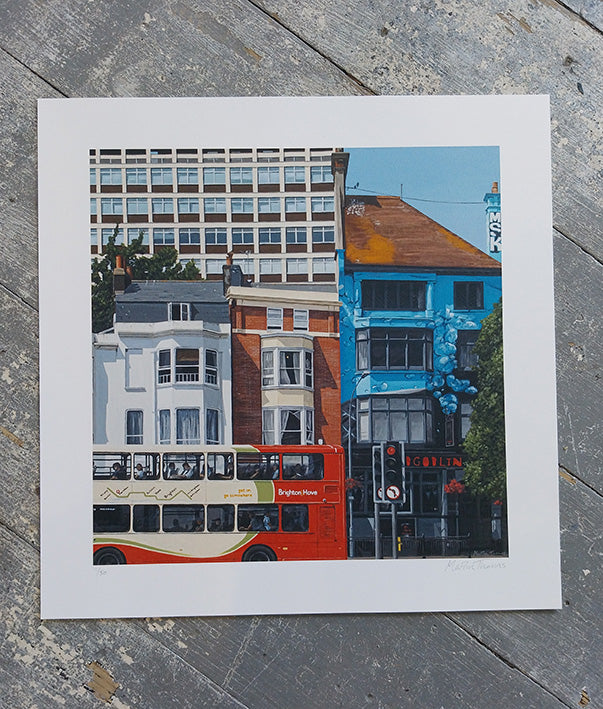 A real life composition inluding The Hobgoblin pub, Brighton Met college and a Brighton Bus.